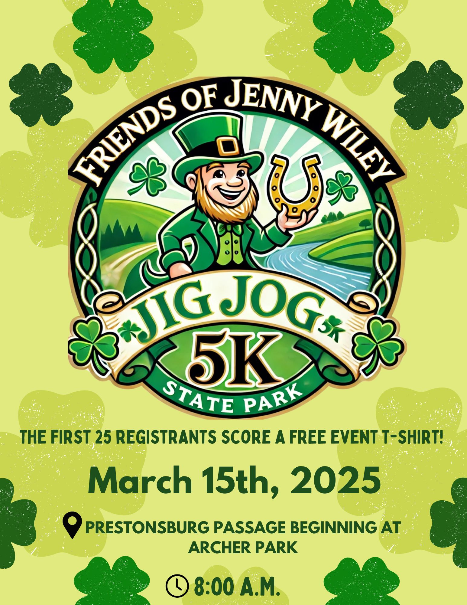 Join Friends of Jenny Wiley on Saturday, March 15th, at 8 AM for a festive run along the Prestonsburg Passage Trail, starting at Archer Park.