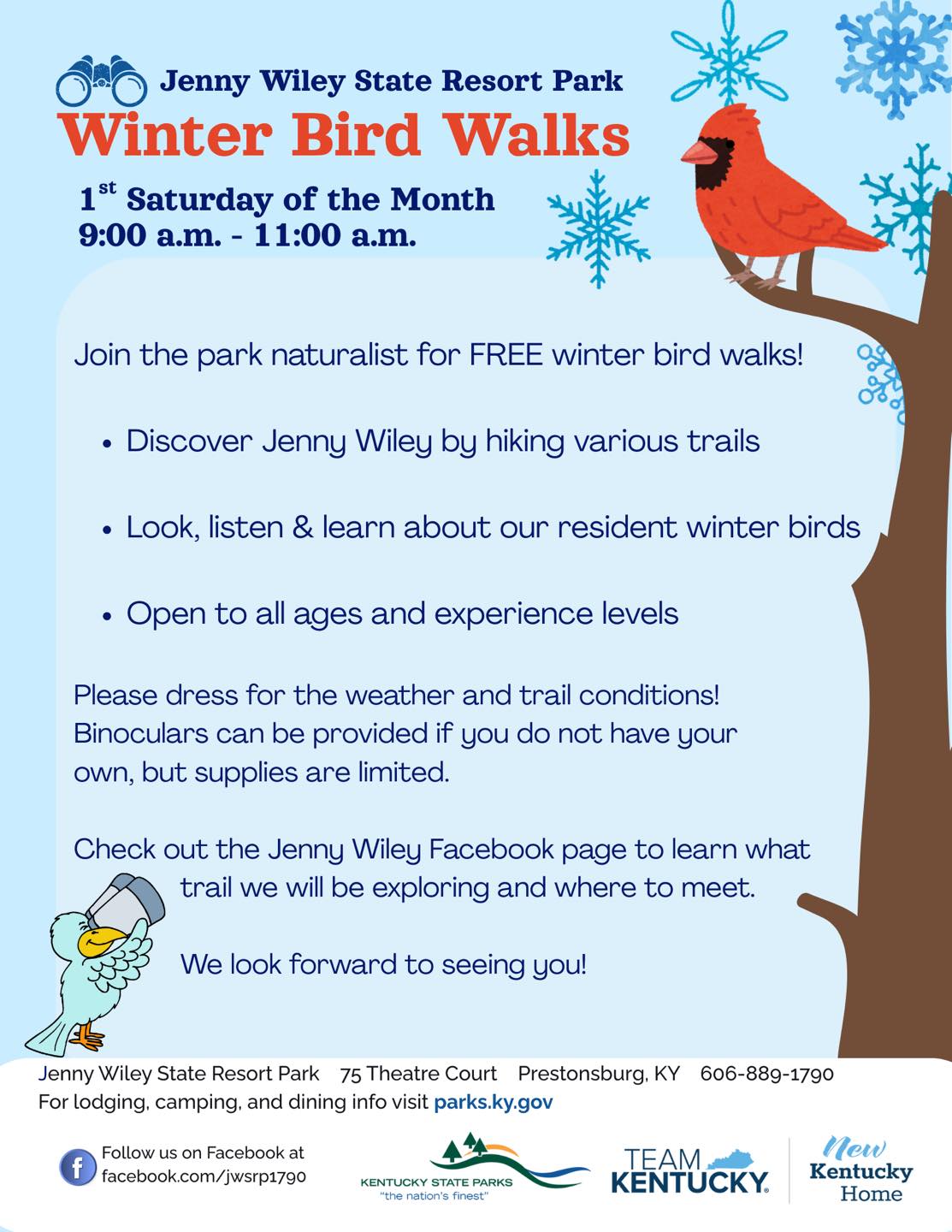 Join the park naturalist for FREE winter bird walks! When: Saturday, February 7th Time: 9 AM–11 AM Location: Sassafras Hiking Trail (Meet in the parking lot) Cost: Free Discover Jenny Wiley by hiking various trailsLook, listen & learn about our resident winter birdsOpen to all ages and experience levelsPlease dress for the weather and trail conditions!Binoculars can be […] |