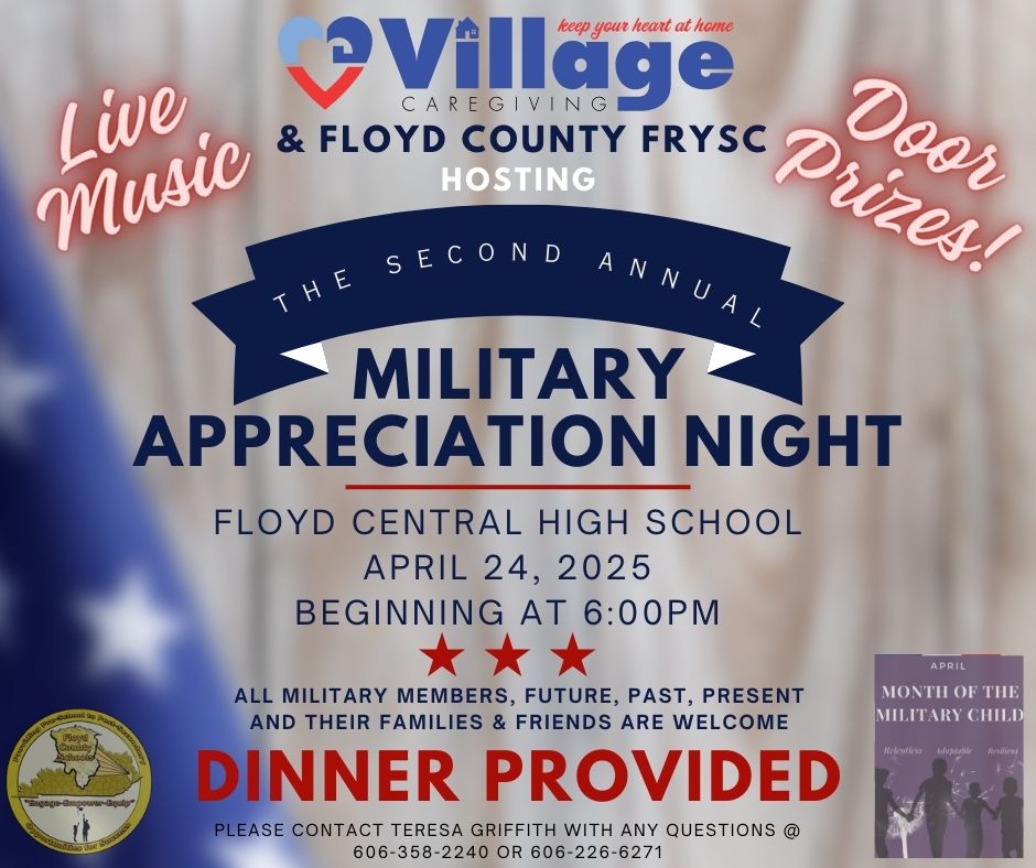 Village Caregiving is honored to host Military Appreciation Night on April 24th at 6 PM at Floyd Central High School! All military members, past and present, and their families are invited to this FREE event featuring live music, dinner, and door prizes as a token of appreciation for their service.
